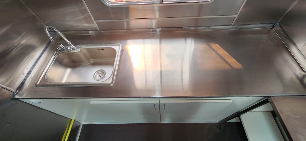 - Mesada de acero inoxidable con bacha e instalación de agua, grifería, depósito de agua.
